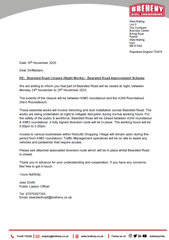Please see attached letter(s) regarding upcoming nightwork & road closures for the A249 Bearsted Road Improvement Project in Maidstone. This will be delivered through letter boxes & to our collated mailing list across the next few days, but I wanted you to have sight of the information before any potential enquiries came in. A newsletter is being prepared & will circulate in the coming weeks with a full update, I will send that through before it's distributed.