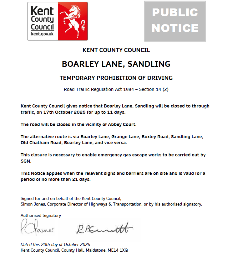 SENT ON BEHALF OF KCC:- BOARLEY LANE, SANDLING - ROAD CLOSURE 17/10/2025 Additional Documents KCC ROAD CLOSURE - BOARLEY LANE, SANDLNG.png